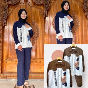 Atasan kemeja lengan panjang dalam set Oversize Viral Kringkel Sablon memiliki kerah kemeja yang menambah kesan elegan. Desain atasan ini sangat cocok untuk berbagai acara, mulai dari acara santai hingga formal.